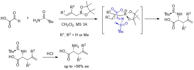 グリオキシル酸とtert-ブタンスルフィンアミドから得られたイミンにアリルボロン酸ピナコールエステルを反応させることにより、アリルアミノ酸誘導体が1段階で得られることを見出しています。 このものの塩酸で処理することにより、高い鏡像体過剰率で光学活性アリルアミノ酸を得ることができます。